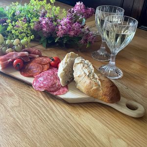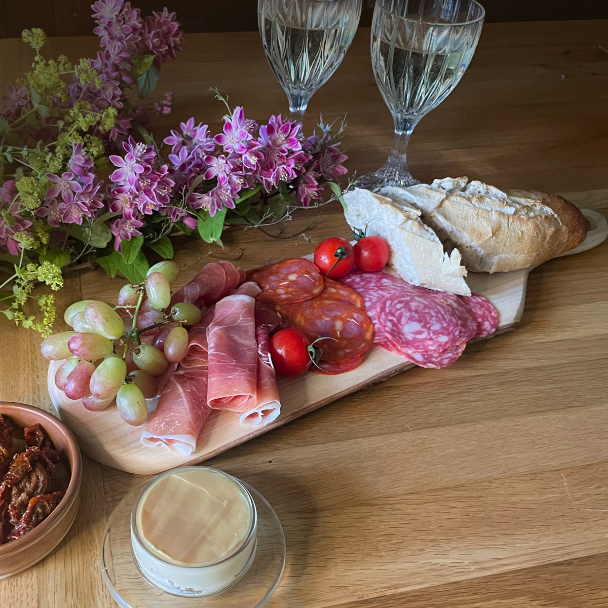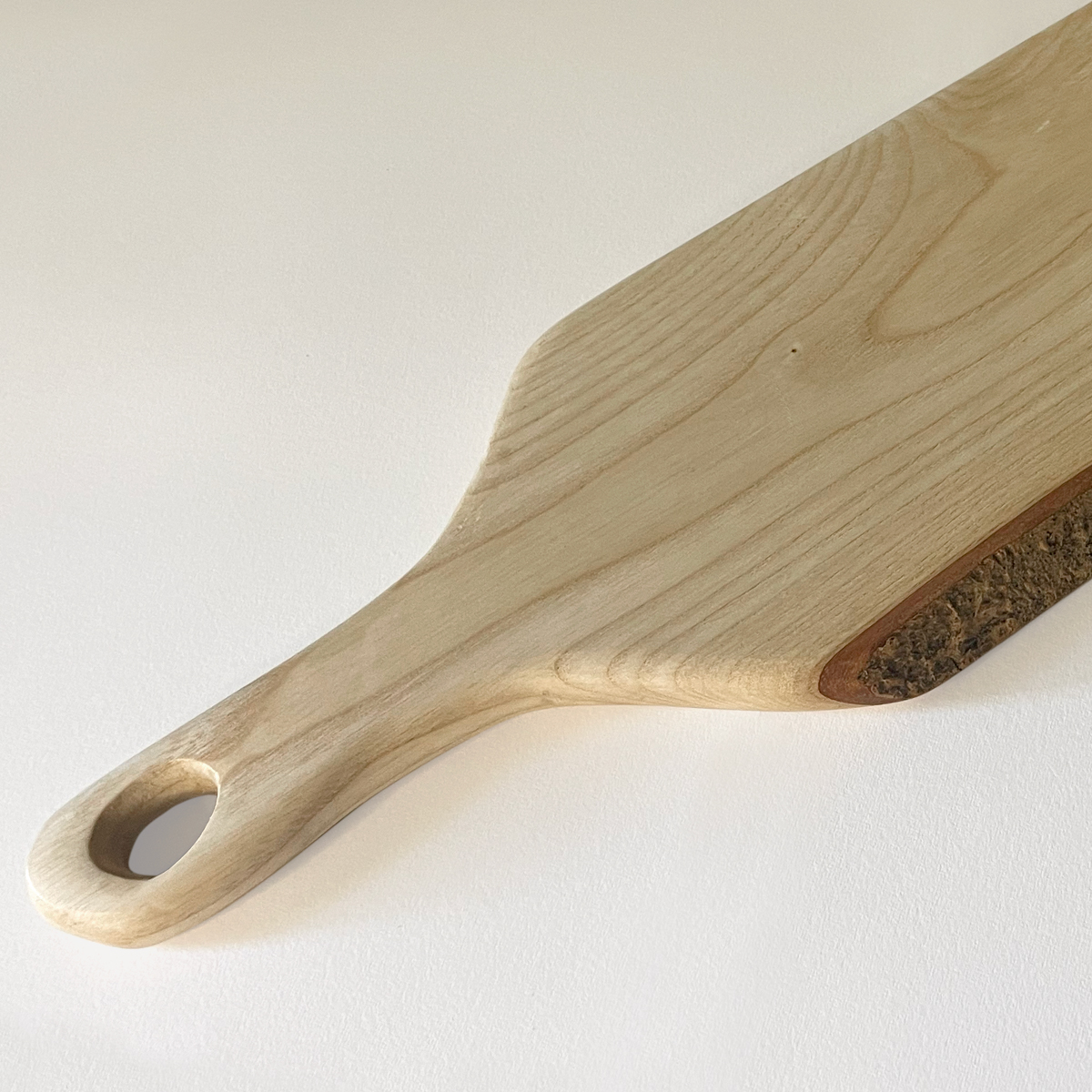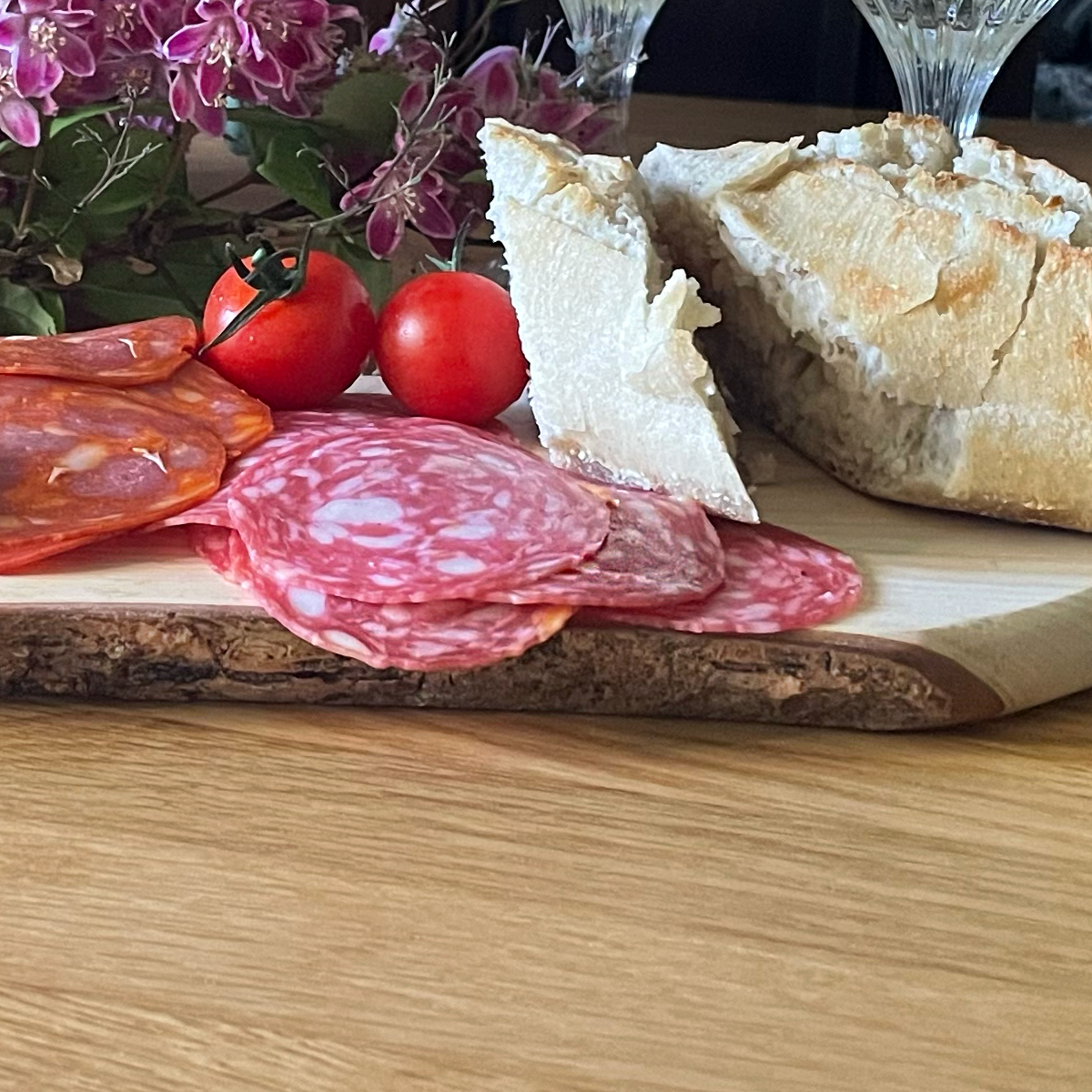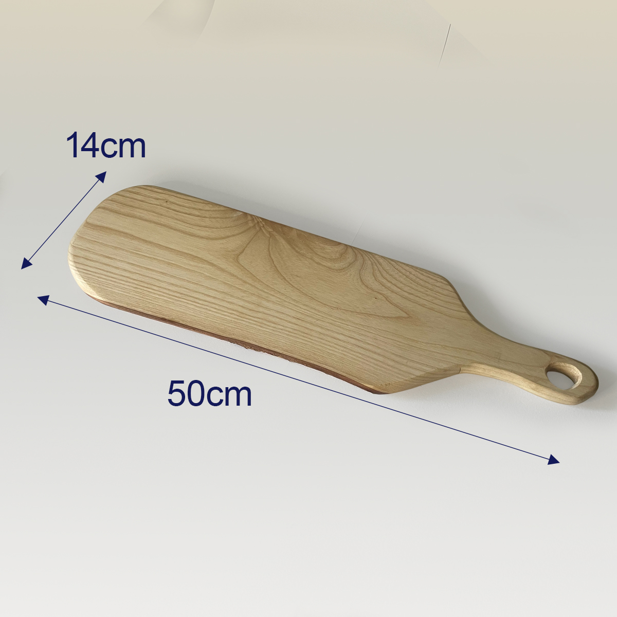 This small ash charcuterie board is perfect for serving cold meats, cheeses, and tapas in style. Crafted with a rustic handle and natural bark edge on the longer sides, it brings charm and character to any table setting.